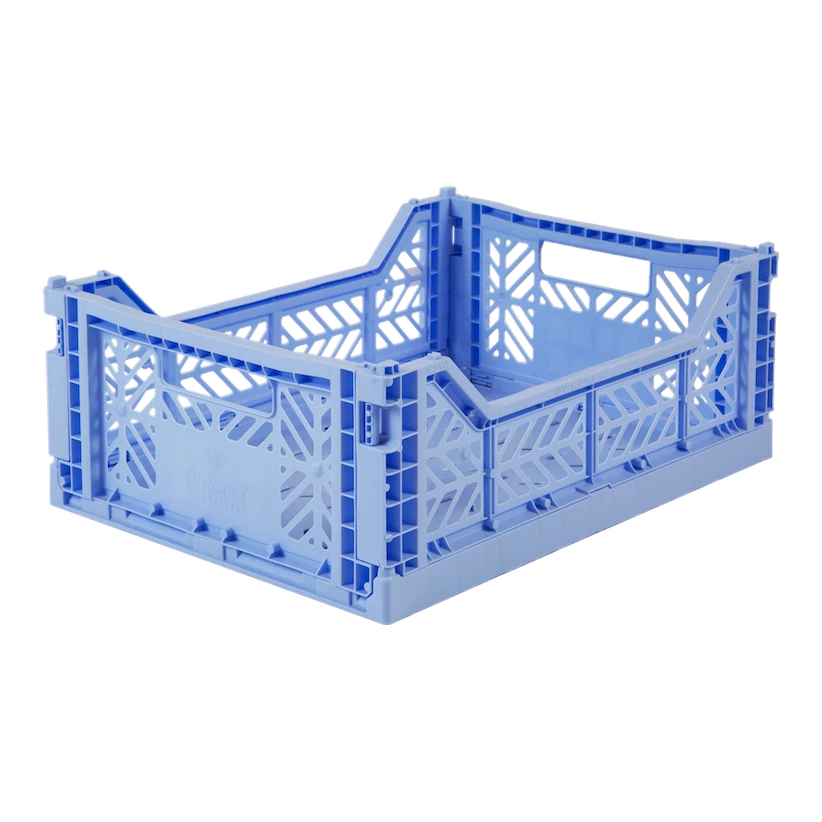Meet the newest trend in interior design and storage! Aykasa folding crates are an innovative and beautiful way to store anything you can think of. The Mini size is perfect for toys, books, clothing, muslins etc. They are also FDA and BGA approved and can easily be washed or put in the dishwasher meaning they are perfect for storing food items or arranging bottles and dummies and can even be used in the refrigerator. They are also 100% recyclable. When not in use they can be folded up completely flat, saving 75% of space. They can also easily be stacked upon each other to efficiently use vertical space. Mix and match the beautiful contemporary colours to suit your style and taste. Durable and long-lasting. Dimensions: 40x30x14 cm Volume: 14.5 litres Loading capacity: 8kg Weight: 450 g Colour: Baby Blue