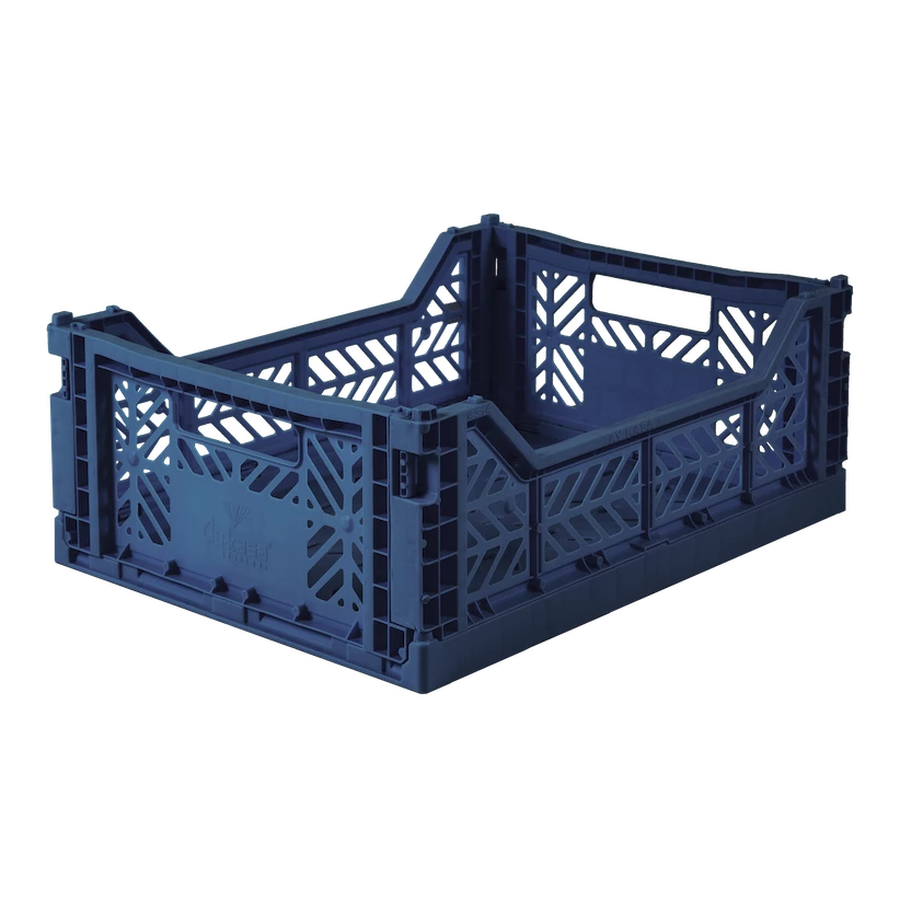 Meet the newest trend in interior design and storage! Aykasa folding crates are an innovative and beautiful way to store anything you can think of. The Mini size is perfect for toys, books, clothing, muslins etc. They are also FDA and BGA approved and can easily be washed or put in the dishwasher meaning they are perfect for storing food items or arranging bottles and dummies and can even be used in the refrigerator. They are also 100% recyclable. When not in use they can be folded up completely flat, saving 75% of space. They can also easily be stacked upon each other to efficiently use vertical space. Mix and match the beautiful contemporary colours to suit your style and taste. Durable and long-lasting. Dimensions: 40x30x14 cm Volume: 14.5 litres Loading capacity: 8kg Weight: 450 g Colour: Navy